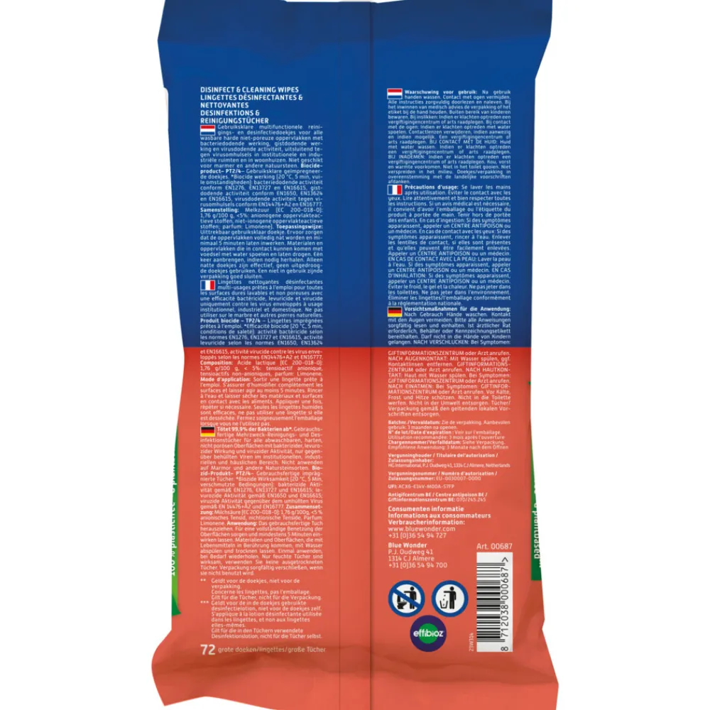 Met Blue Wonder Desinfectie Reiniger Doekjes XL maak je in een handomdraai alles schoon en bacterievrij. De doekjes reinigen en doden 99,9% bacteriën en schimmels. Ideaal voor thuis en op reis. Blue Wonder Desinfectie Reiniger Doekjes XL zijn ideaal voor dagelijks gebruik in huis, maar ook onderweg. Bevatten geen chloor en alcohol en laten geen schadelijke chemische resten achter. Groot formaat doekjes. Geschikt voor allerhande oppervlakken en objecten, zoals aanrecht, toilet, speelgoed en meer.