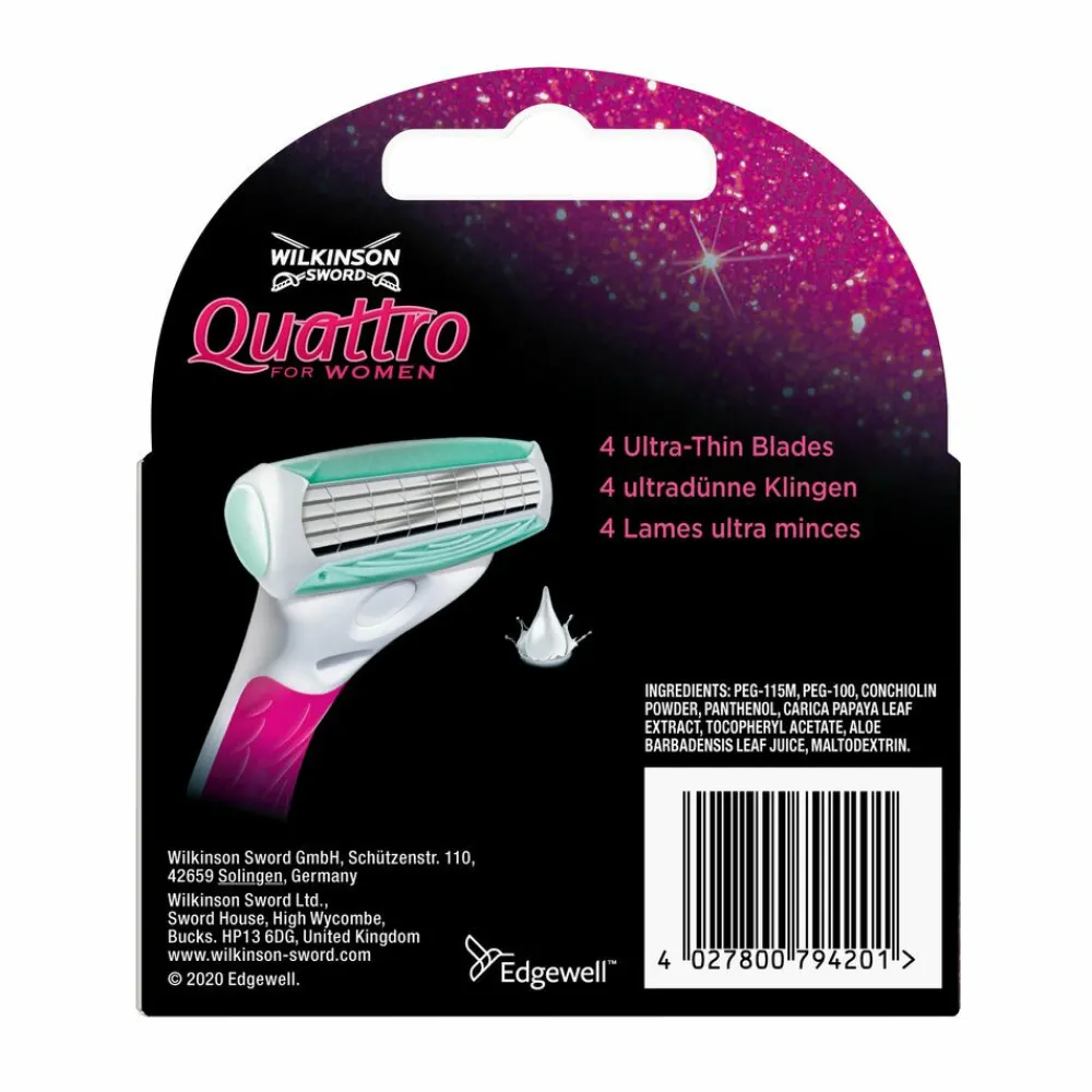 De Wilkinnson Quattro Sensitive for Women biedt vier ultradunne mesjes en een geïntegreerde conditioningstrip met Aloë Vera en Vitamine E. Voor een langdurig fluweelzachte huid – ideaal voor alledaagse avonturen!