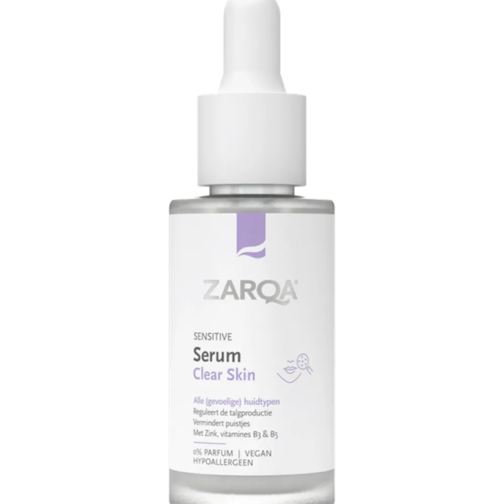 ZARQA Serum Clear Skin zuivert en ondersteunt de balans van de huid. Puistjes en mee-eters worden voorkomen. ZARQA Serum Clear Skin met mineralencomplex zuivert en ondersteunt de balans van de vette huid. Zink, vitamines B3 & B5 reguleren de talgproductie en verminderen het glanzende uiterlijk van de vette huid. Puistjes en mee-eters worden voorkomen. De lichtgewicht formule trekt snel in tot diep in de huidlagen.
