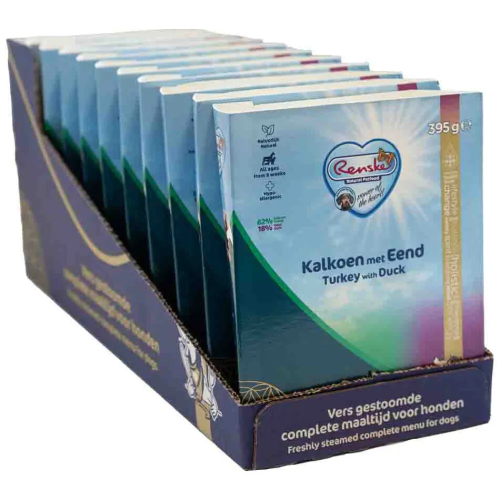 Renske Vers Gestoomd Complete Menu Kalkoen – Eend is een vlees maaltijd voor jonge en volwassen honden van alle rassen vanaf 9 weken. De voeding bevat minimaal 80% vers gestoomde kalkoen en eend en is aangevuld met wat bruine rijst, duurzaam geteelde moestuingroenten en kruiden. De zuivere, verse en natuurlijke ingrediënten zijn licht gestoomd en vacuüm geseald voor het behoud van de noodzakelijke voedingstoffen. Omdat het product gestoomd is, is het product 100% veilig en ideaal voor onderweg of op vakantie.