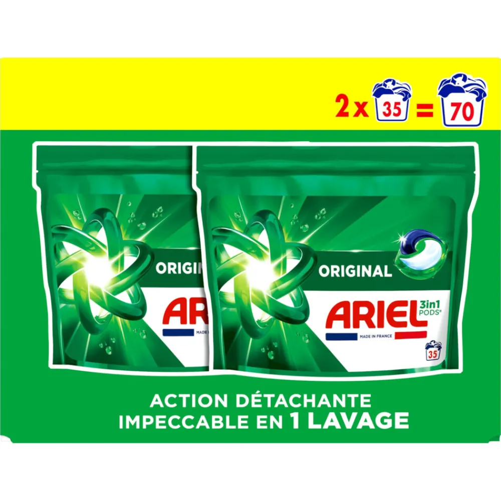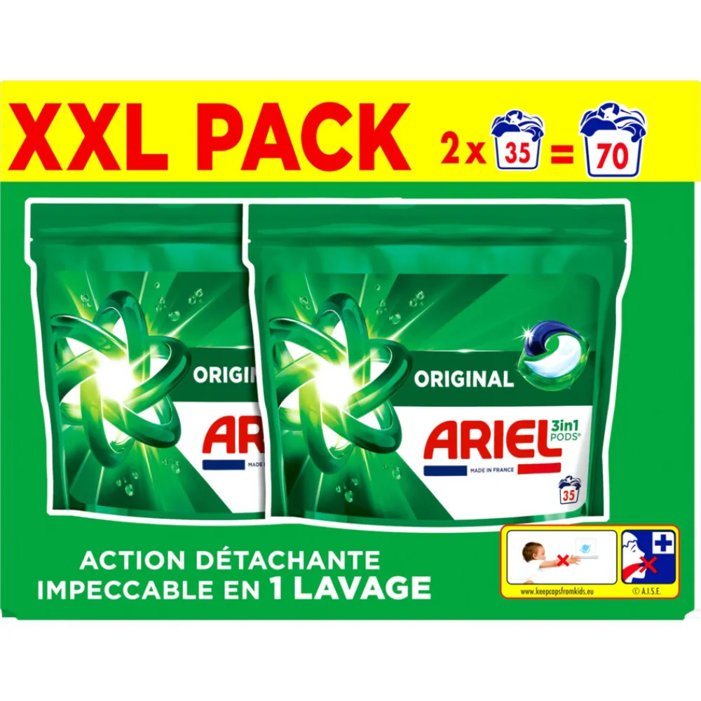 Ariel 3in1 Pods wasmiddelcapsules Original bieden onberispelijke vlekverwijdering in 1 wasbeurt. Ze zijn ontworpen om briljant te werken, zelfs in koudere cycli, en lossen snel op, zelfs in koud water, en bieden onberispelijke resultaten en een frisse, langdurige geur. Koude wasprogramma’s helpen stoffen langer te beschermen (vergeleken met warmwatercycli). Voor het beste resultaat, Pods eerst achterin de lege trommel en doe je je kleding er bovenop. Ariel 3in1 Pods worden ook in Frankrijk gemaakt. Om meer te weten te komen over ons merk en het verhaal achter ons product & onze ervaring met koud wassen, ga naar enviedeplus.com of zininmeer.be. Bewaar de Ariel 3in1 Pods wasmiddelcapsules altijd buiten het bereik van kinderen. Ga naar keepcapsfromkids.eu voor meer informatie.