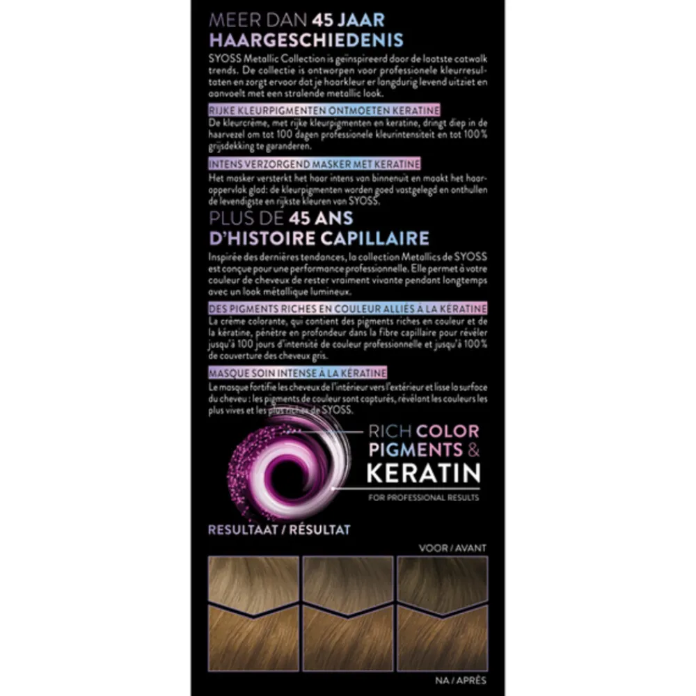 SYOSS permanente haarkleuringen, ontworpen voor professionele resultaten, zorgen ervoor dat je haarkleur er langdurig levend uitziet en aanvoelt. De kleurcrème, met rijke kleurpigmenten en keratine, dringt diep in de haarvezel om tot 100 dagen professionele kleurintensiteit en tot 100 % grijsdekking te garanderen. Het intens verzorgend masker met keratine versterkt het haar intens van binnenuit en maakt het haaroppervlak glad: de kleurpigmenten worden goed vastgelegd en onthullen de levendigste en rijkste kleuren van SYOSS.