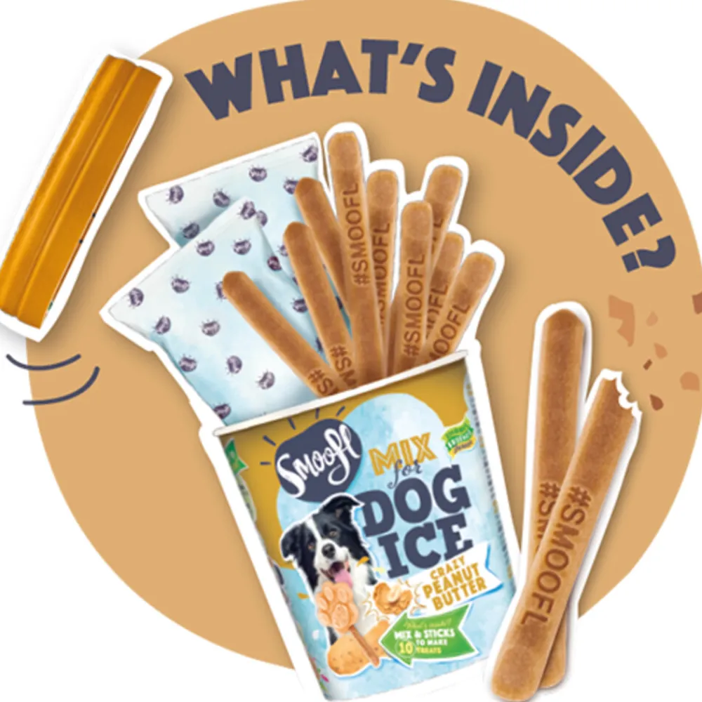 In het potje hondenijs zitten 10 eetbare stokjes waarvan je viervoeter kan genieten. De Smoofl hondenijsjes zijn zeer eenvoudig te maken en klaar in slechts 60 seconden.