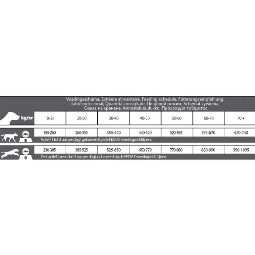In onderstaand voerschema lees je de dagelijkse voerhoeveelheid af. Verdeel deze hoeveelheid voer over twee of meer maaltijden per dag. Het voerschema is gebaseerd op gemiddelden. Houd daarom altijd de conditie van je hond goed in de gaten en pas de hoeveelheid voer hier eventueel op aan of neem contact met ons op voor advies. Zorg ervoor dat er altijd vers en schoon drinkwater beschikbaar is.
