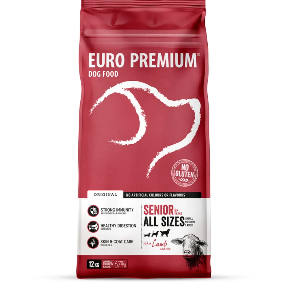 Euro-Premium Senior – Lam & Rijst is een volledige, super-premium voeding voor volwassen honden (vanaf 8 jaar ). Deze voeding ondersteunt het vitaal ouder worden van uw senior hond. Het brokje heeft een gaatje zodat het makkelijker kan breken tijdens het kauwen. Een goed geheugen en een goede mobiliteit worden ondersteund door de Omega-3 vetzuren DHA en EPA. Ook zijn gewrichts-ondersteunende componenten toegevoegd.