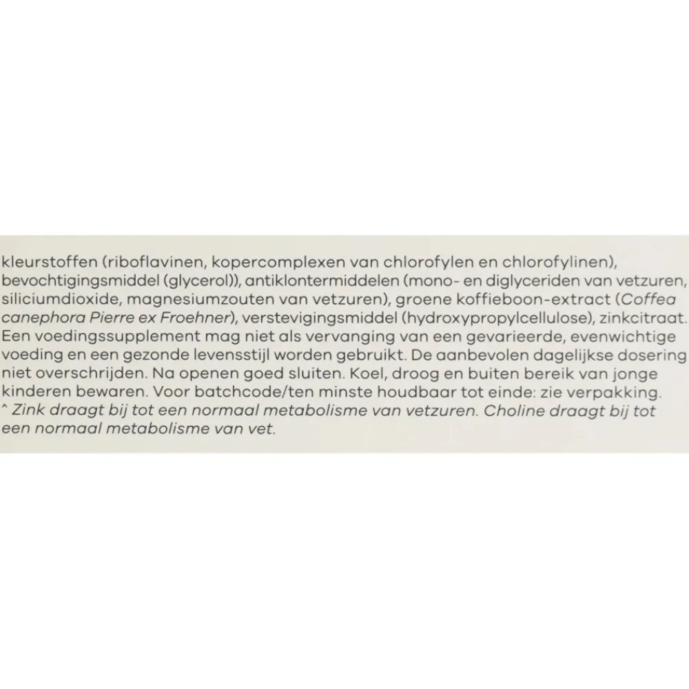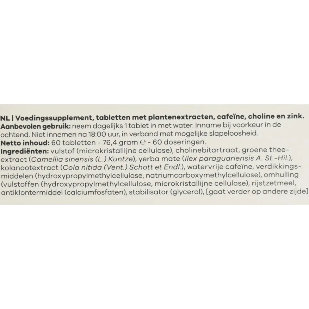 Vulstof (microkristallijne cellulose), cholinebitartraat, groene thee-extract (Camellia sinensis (L.) Kuntze), yerba mate (Ilex paraguariensis A. St.-Hil.), kola noot extract (Cola nitida (Vent.) Schott et Endl.), watervrije cafeïne, verdikkingsmiddelen (hydroxypropylmethylcellulose, natriumcarboxymethylcellulose), omhulling (vulstoffen (hydroxypropylmethylcellulose, microkristallijne cellulose), rijstzetmeel, antiklontermiddel (calciumfosfaten), stabilisator (glycerol), kleurstoffen (riboflavinen, kopercomplexen van chlorofylen en chlorofylinen), bevochtigingsmiddel (glycerol)), antiklontermiddelen (mono- en diglyceriden van vetzuren, siliciumdioxide, magnesiumzouten van vetzuren), extract van groene koffiebonen (Coffea canephora Pierre ex Froehner), verstevigingsmiddel (hydroxypropylcellulose), zinkcitraat.