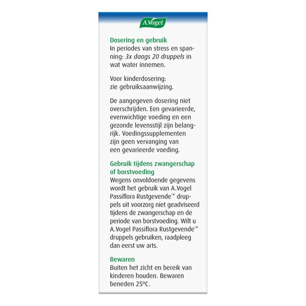 - Wegens onvoldoende gegevens wordt geadviseerd om A.Vogel Passiflora complex uit voorzorg niet te gebruiken tijdens de zwangerschap en de periode van borstvoeding. Wil jeA.Vogel Passiflora complex gebruiken, raadpleeg dan eersteen arts.