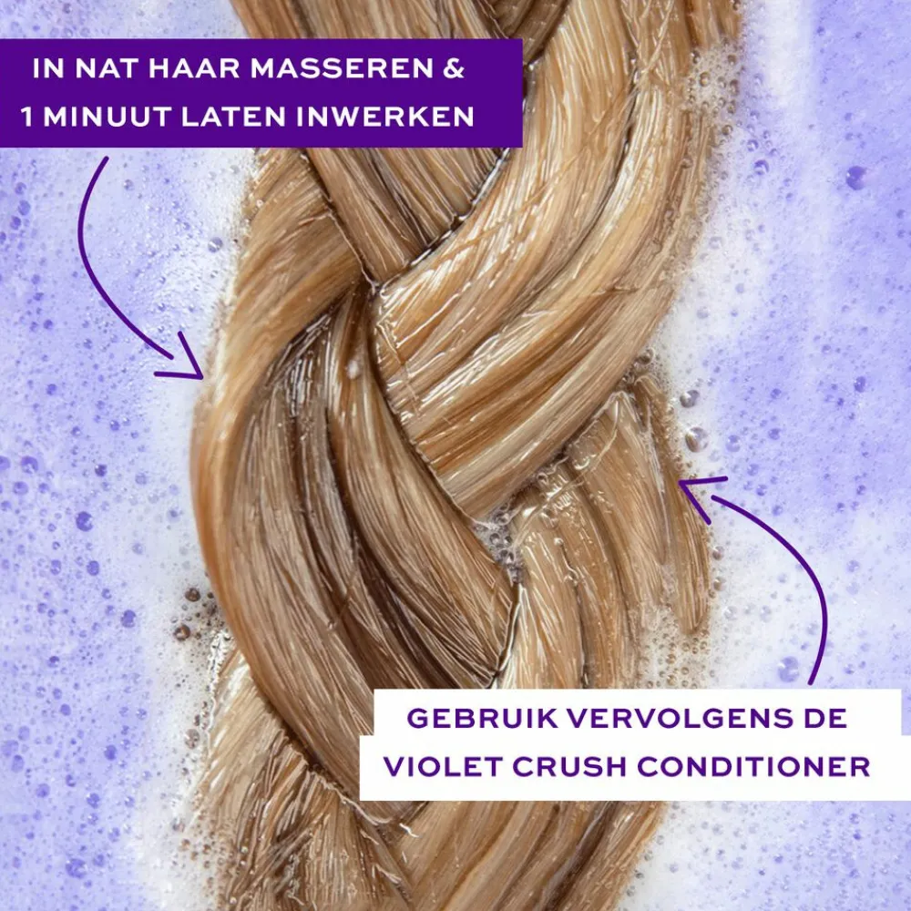 - Violet Crush shampoo neutraliseert geleidelijk ongewenste gele tonen en geeft je haar die koele blonde tint terug.