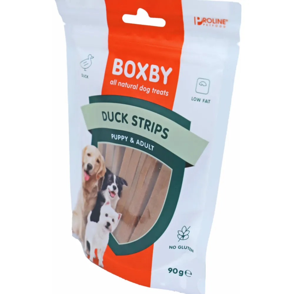 Proline Boxby duck strips zijn eiwitrijke strips met een laag vetgehalte, glutenvrij en veel toegevoegd vlees (eend).
