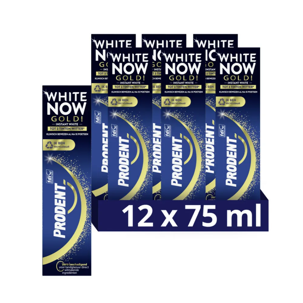 Prodent White Now Gold Tandpasta maakt je tanden optisch tot 3 tinten witter, al na de eerste poetsbeurt. Op de langere termijn verwijdert deze whitening tandpasta ook de aanslag op je tanden voor een langdurig witter resultaat. De tandpasta bevat de vertrouwde bescherming van een fluoridetandpasta. Met Prodent White Now Gold Tandpasta combineer je de bescherming van een normale fluoridetandpasta met een extra witmakend effect. Al vanaf de eerste poetsbeurt zijn je tanden direct tot 3 tinten witter, extra fris en heb je een stralende glimlach.