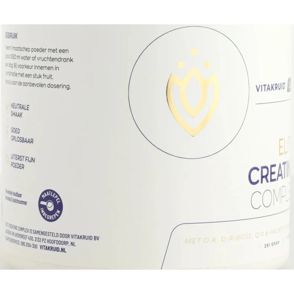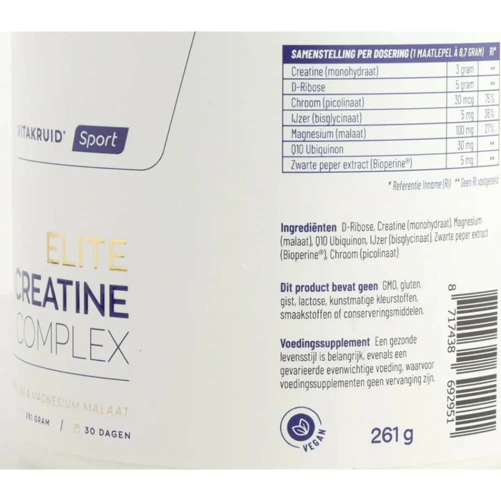 Vitakruid Elite Creatine Monohydraat Complex met o.a. D-Ribose, Q10 & Magnesium Malaat. D-Ribose heeft een bewezen samenwerking met creatine. Chroom, magnesium en ijzer dragen bij aan het energiemetabolisme. Creatine zorgt voor meer kracht en verhoogt fysieke prestaties bij korte intensieve oefeningen (bij 3 gram dagelijkse inname).