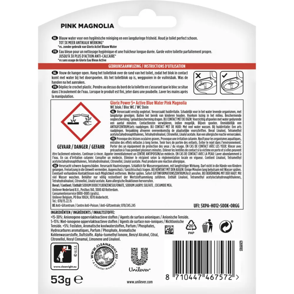 Glorix Power 5+ Actief Blauw Water Pink Magnolia Wc Blok voor een hygiënisch schoon en langdurig fris toilet. Het product heeft diverse voordelen! Het toiletblokje geeft elke spoelbeurt de kracht van nieuwe Glorix Power 5+! Het reinigende schuim met 3x meer antikalk-werking* zorgt voor glans en een hygiënische reiniging. De langdurige werking van het Pink Magnolia-parfum houdt je toilet lang fris. Bovendien blijft het water in het toilet langer blauw. Glorix Power 5+ voor een intens hygiënische reiniging. Met Glorix is je hele toilet écht schoon en hygiënisch fris! Gebruik in combinatie met de andere reinigingsproducten van Glorix voor een optimaal resultaat.