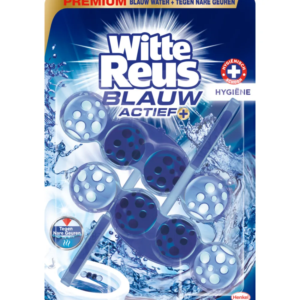 Ontdek Witte Reus Blauw Actief+ Hygiëne voor een hygiënisch schoon en glanzend toilet. Dit toiletblok zorgt ervoor dat je toilet makkelijk schoon en fris te houden is van de eerste tot de laatste spoelbeurt. Witte Reus Blauw Actief+ heeft een speciale houder met blauwe ballen, die bij elke spoelbeurt worden geactiveerd in een zichtbare reinigingservaring met blauw water. Daarnaast bevat de formule reinigings polymeren waardoor je toilet er schoner uit ziet dan ooit tevoren door de 50% extra glans* op het toiletoppervlak.