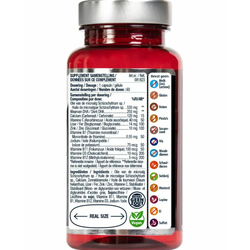 Olie van de microalg Schizochytrium sp., Calcium, Zonnebloemolie (Oleum helianthus), IJzer, Zink, Vitamine C, Stabilisator (Mono- en diglyceriden van vetzuren, Sojalecithine), Vitamine B11, Vitamine B1, Vitamine B12, Vitamine D3, Jodium.