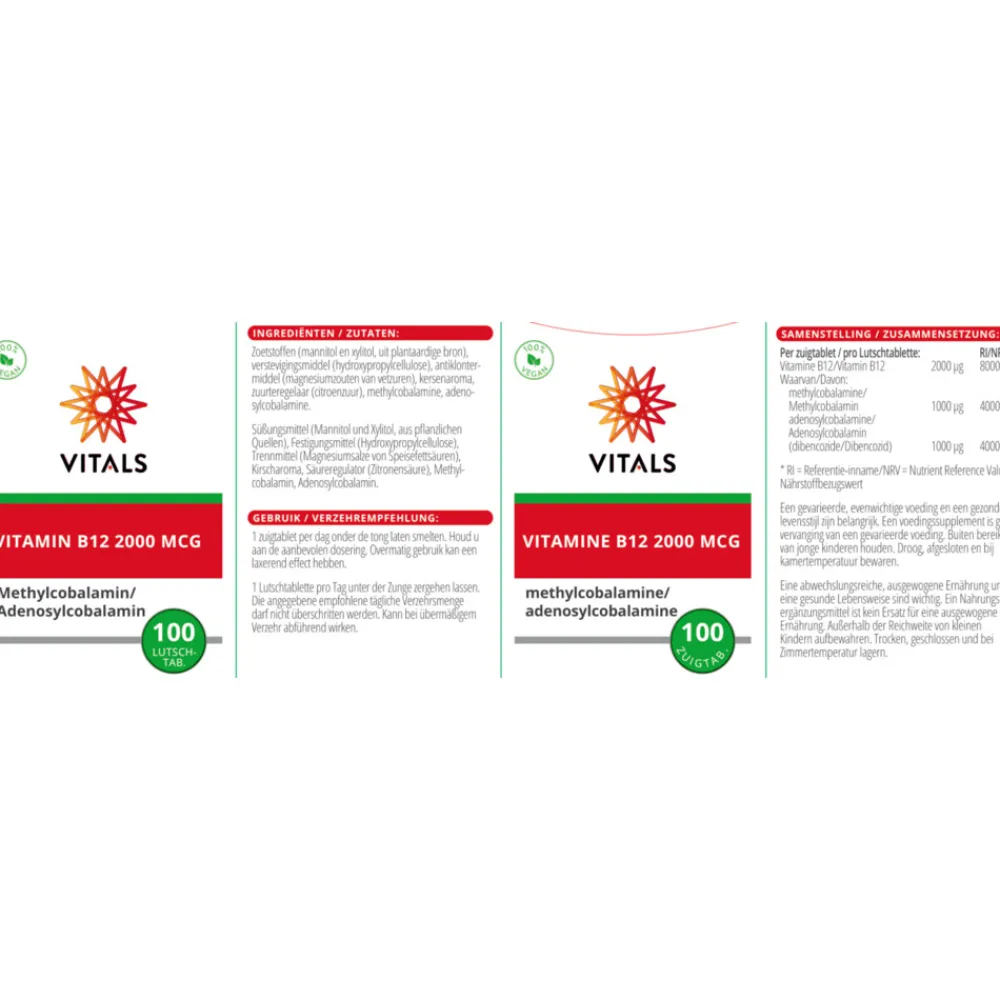 Vitals Vitamine B12 2000mcg bestaat uit zuigtabletjes met de biologisch actieve vormen methylcobalamine en adenosylcobalamine (ook wel dibencozide genoemd). Dit zijn de vormen zoals vitamine B12 in de voeding voorkomt en door het lichaam gebruikt wordt.