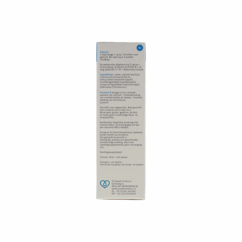 TS Choice Vitamine D Spray bevat de natuurlijke vorm van vitamine D3 (1000 IE) die bijdraagt aan het behoud van normale botten en tanden en voor de normale werking van het immuunsysteem. Iedere spray bevat 25 mcg vitamine D. Bij gebruik van de aanbevolen één spray per dag, doe je maar liefst 125 dagen met een verpakking. TS Choice Vitamine D 1000 Spray werd voorheen verkocht onder de naam Best Choice Vitamine D 1000 Spray. Alleen de naam is gewijzigd, de samenstelling niet.