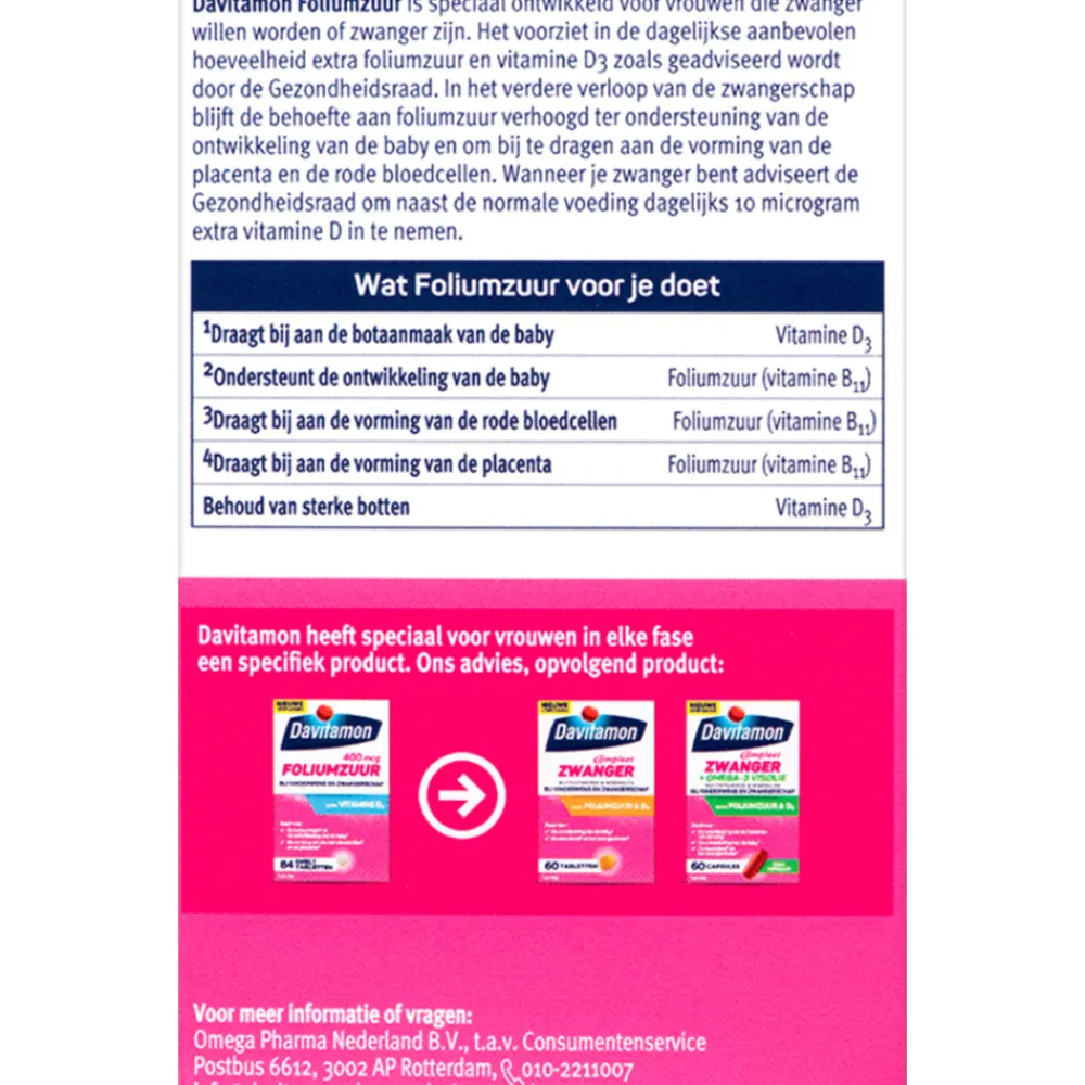 Davitamon Foliumzuur met vitamine D is speciaal ontwikkeld voor vrouwen die zwanger willen worden of net zwanger zijn. Het voorziet in de dagelijkse aanbevolen hoeveelheid extra foliumzuur en vitamine D zoals geadviseerd wordt door de Gezondheidsraad.
