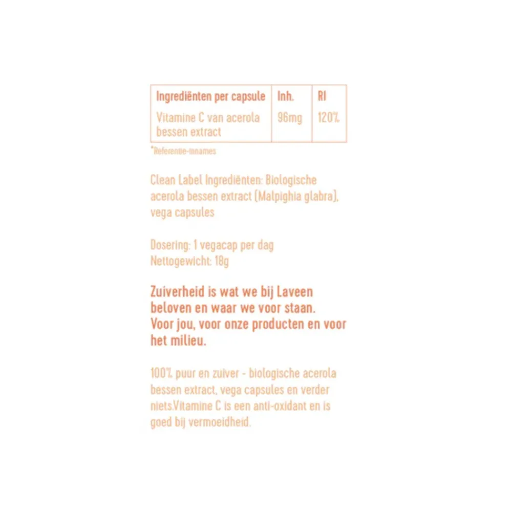 Laveen Vitamine C Acerola Biologisch is gemaakt van 100% biologisch Acerola extract. Dit product bevat geen additieven of kunstmatige stoffen en is van hoge biologische kwaliteit. Acerola is een krachtige bron van vitamine C. Door het schokvriezen blijven de voedingsstoffen vrijwel volledig behouden. Bovendien is de vitamine C in dit supplement afkomstig uit acerola die gekweekt is volgens de biologische productiemethode, waarbij geen gebruik wordt gemaakt van chemische bestrijdingsmiddelen of kunstmest.