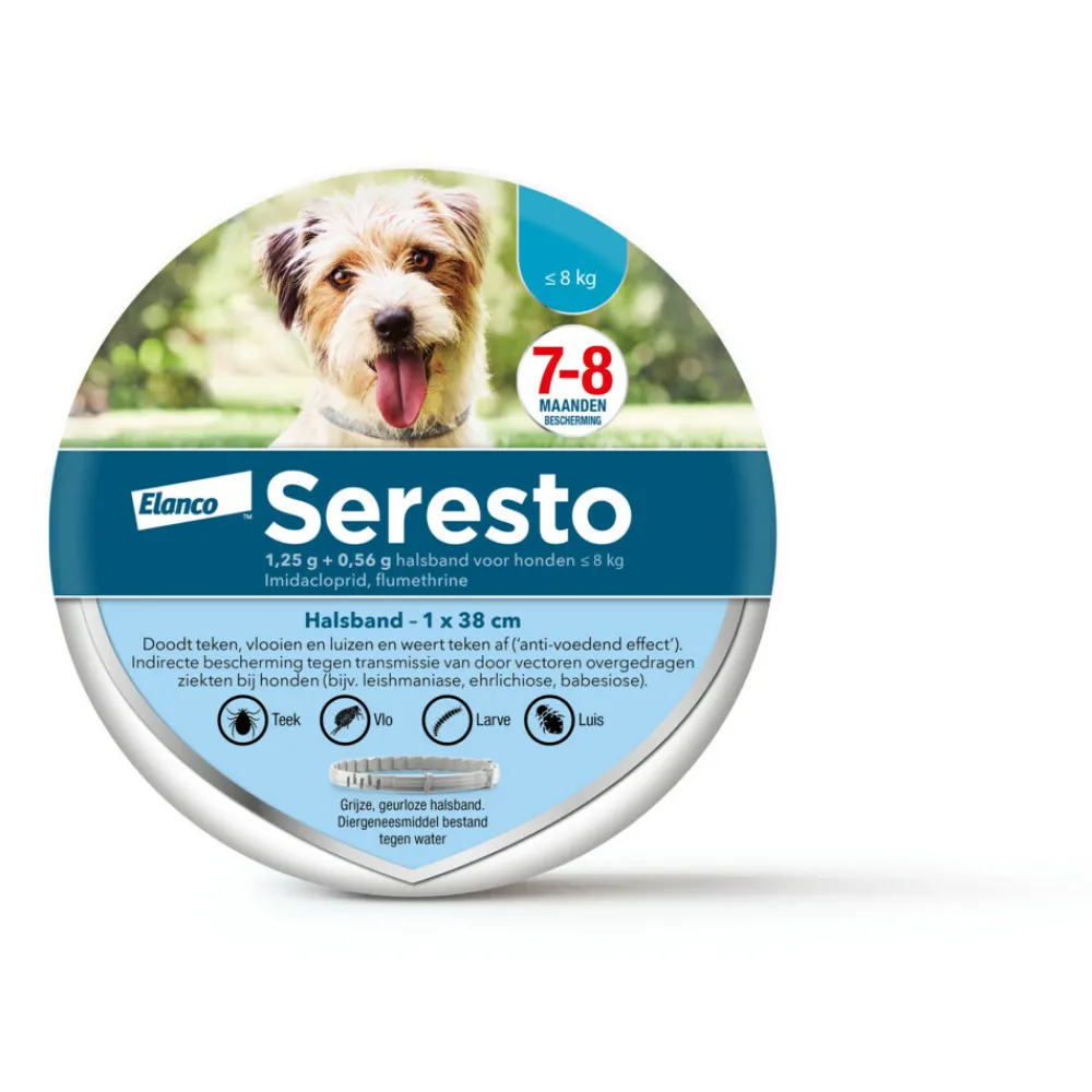 De geurloze halsband van Seresto beschermt je hond tot 8 maanden tegen vlooien en teken. Geschikt voor honden tot 8 kg. Seresto is een vlooien en tekenband die na aanbrengen direct bescherming biedt tegen vlooien en binnen twee dagen tegen teken. Let wel op, de Seresto vlooien halsband mag niet gebruikt worden bij pups die jonger zijn dan 7 weken.