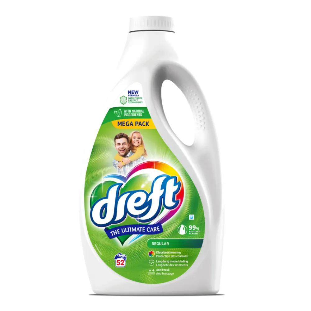Met de nieuwe geconcentreerde formule van Dreft Regular was je nog efficiënter. Je hebt minder wasmiddel per wasbeurt nodig en geniet toch van een perfect schoon resultaat. Dankzij de extra kleurbescherming blijven je kledingstukken langer mooi, terwijl de intensere parfumboost zorgt voor een langdurige frisheid. Dreft staat bekend om zijn milde en veilige verzorging, ideaal voor dagelijks gebruik. Geschikt voor zowel gekleurde als witte was, met aandacht voor vezelbescherming en een anti-kreukwerking. Bovendien bevat Dreft natuurlijke ingrediënten en komt het in een fles van 99% gerecycled plastic.