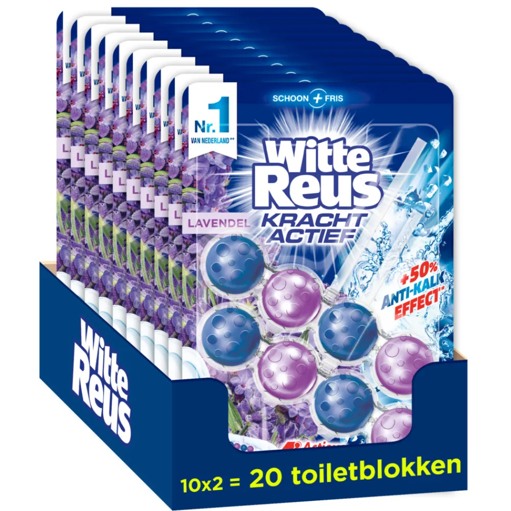 Op zoek naar een makkelijke manier om je toilet schoon en fris te houden? Witte Reus Kracht Actief Lavendel wcblok zorgt voor een schoon en fris toilet van de eerste tot de laatste spoelbeurt. Het Witte Reus Kracht Actief toiletblok bestaat uit een formule met 4 actieve functies: reinigend schuim, anti-kalk formule, vuilbeschermer en extra frisheid. De Kracht Actief toiletreiniger range bevat het luchtverfrissereffect die ervoor zorgt dat de badkamer lange tijd met een frisse lavendel geur wordt gevuld.