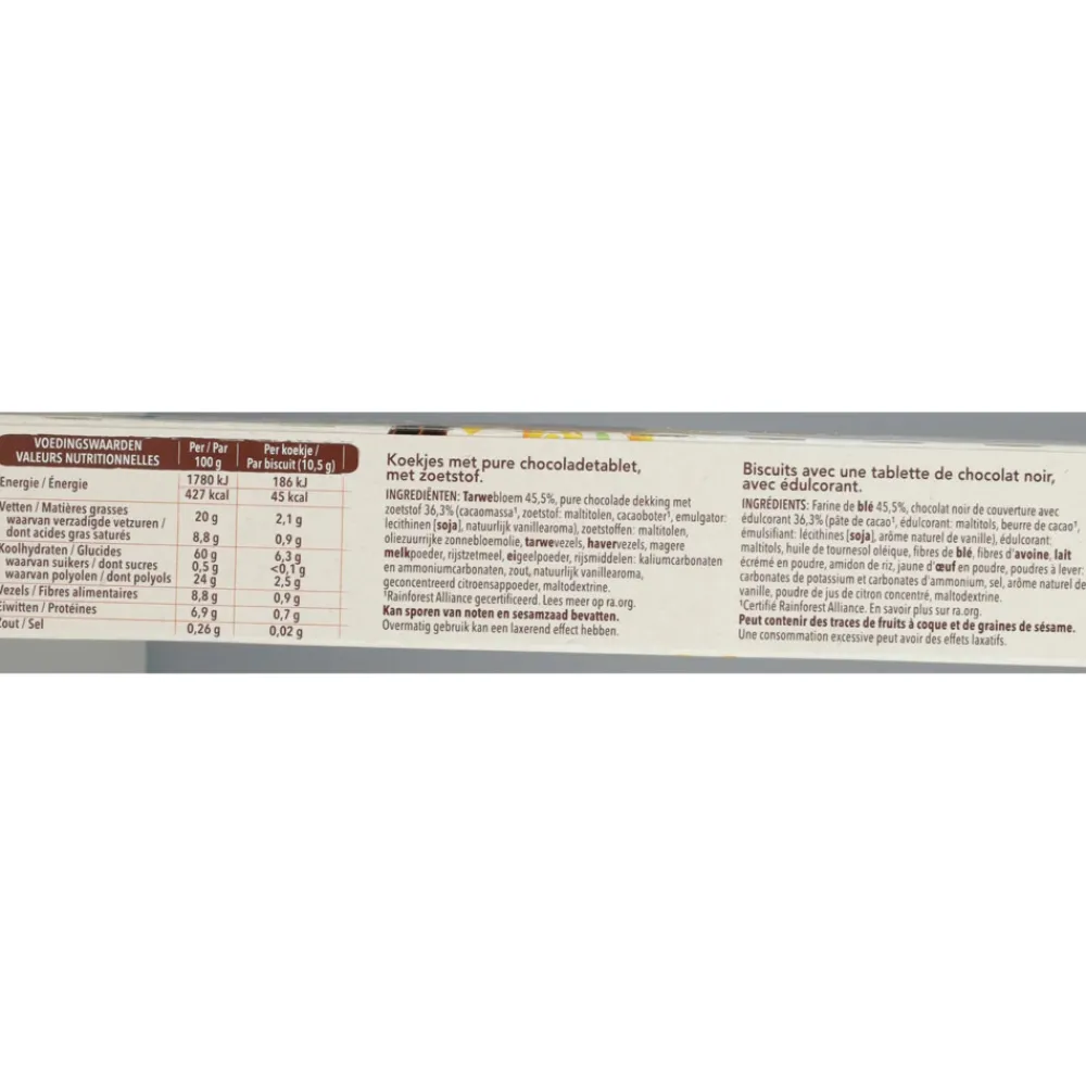 Tarwebloem, chocolade met zoetstof 38% (cacaomassa, zoetstof: maltitolen, cacaoboter, emulgator: sojalecithinen, natuurlijk vanillearoma), zoetstoffen: maltitolen en sucralose, zonnebloemolie, magere melkpoeder, botervet, rijstzetmeel, eigeelpoeder, zout, citroensap in poeder (geconcentreerd citroensap, maltodextrine), rijsmiddelen: natriumcarbonaten en ammoniumcarbonaten, natuurlijk vanillearoma.