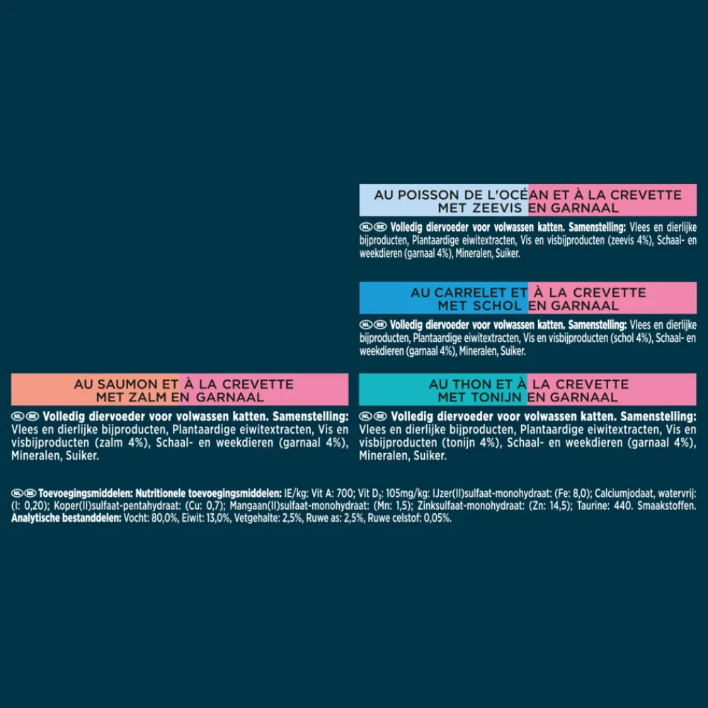 Tonijn : Vlees en dierlijke bijproducten, plantaardige eiwitextracten, vis en vis bijproducten (tonijn 4%), weekdieren en schaaldieren (hele garnalen 4%), mineralen, suiker.