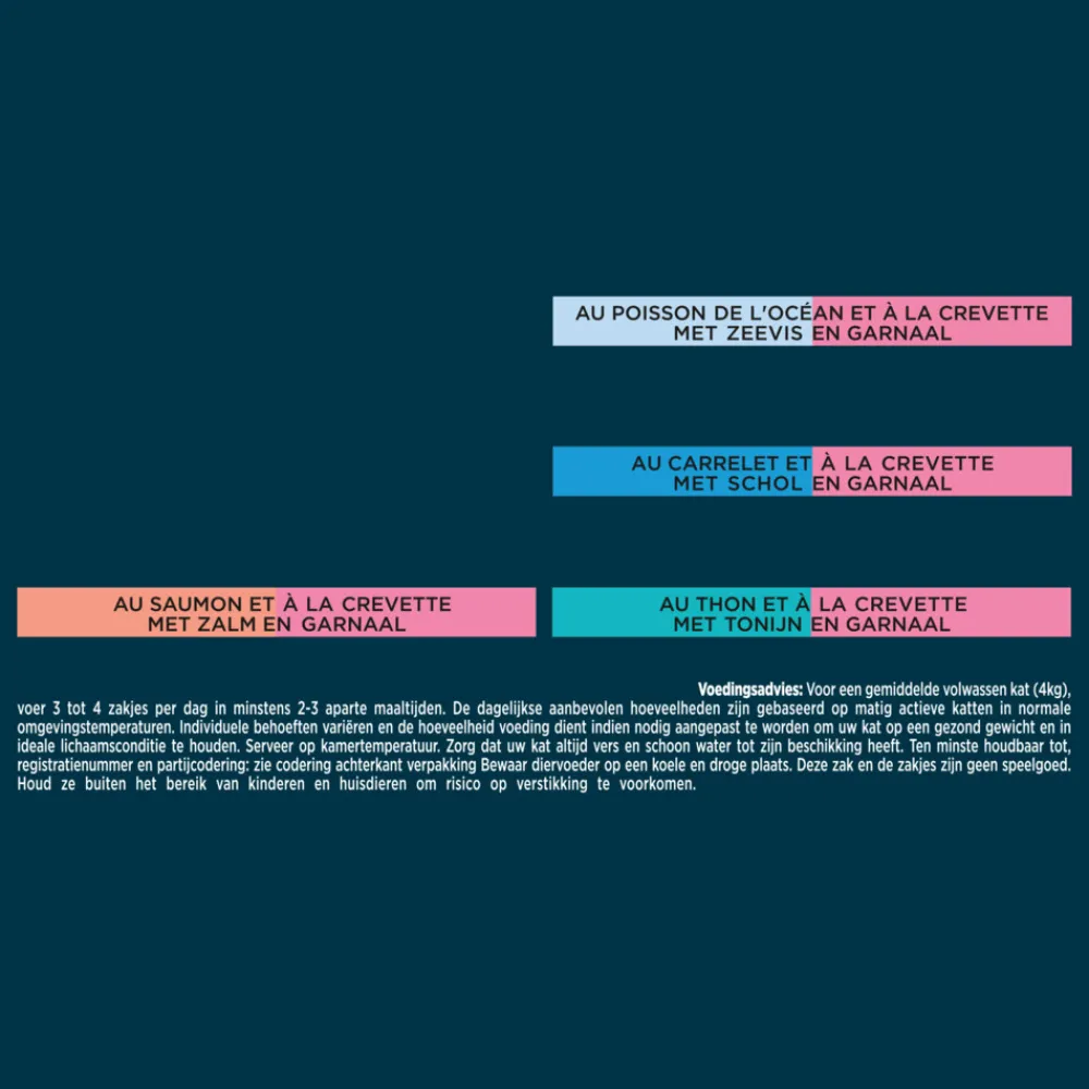 Zeevis : Vlees en dierlijke bijproducten, plantaardige eiwitextracten, vis en vis bijproducten (zeevis 4%), weekdieren en schaaldieren (hele garnalen 4%), mineralen, suiker