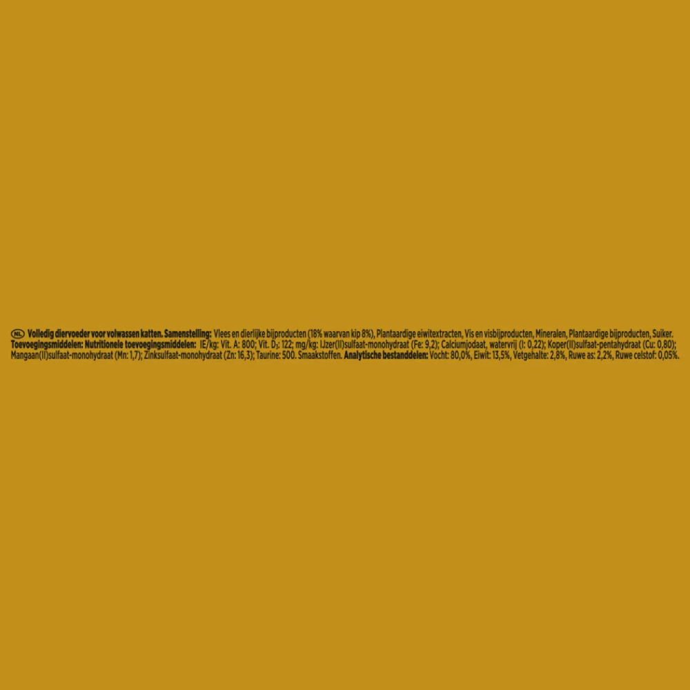 Met Kip: Vlees en dierlijke bijproducten (18% waarvan kip 8%), Plantaardige eiwitextracten, Vis en visbijproducten, Mineralen, Plantaardige bijproducten, Suiker.