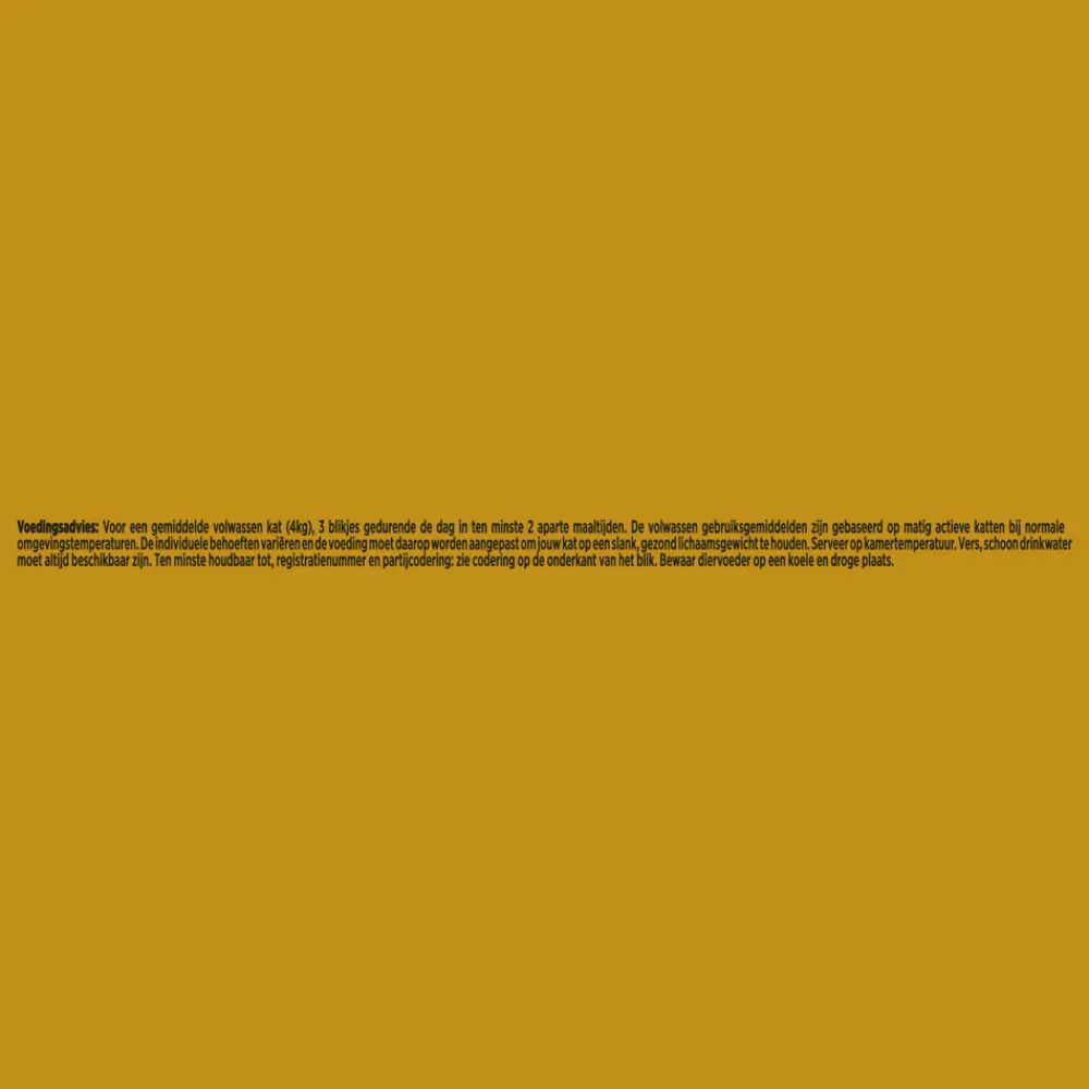 Voor een gemiddelde volwassen kat van 4 kg, wordt aanbevolen om gedurende de dag 3 blikjes te geven, verdeeld over minimaal 2 aparte maaltijden. Houd er rekening mee dat de individuele behoeften van katten kunnen variëren, en dat het voedingspatroon dienovereenkomstig moet worden aangepast om jouw kat op een gezond en slank lichaamsgewicht te houden. De gebruiksaanwijzingen zijn gebaseerd op matig actieve katten die leven in normale omgevingstemperaturen. Zorg ervoor dat het voer op kamertemperatuur wordt geserveerd en dat er altijd vers en schoon drinkwater beschikbaar is. De houdbaarheidsdatum en partijcodering staan vermeld op de onderkant van het blikje. Bewaar het diervoeder op een droge en koele plaats.