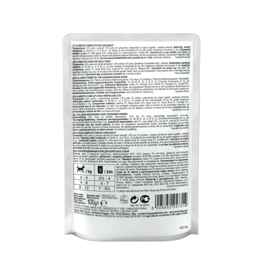Stuzzy reepjes met kip en ham voor honden bereid met natuurlijke ingrediënten, langzaam gegaard om jouw hond een maaltijd te bieden die zowel compleet als rijk van smaak is.