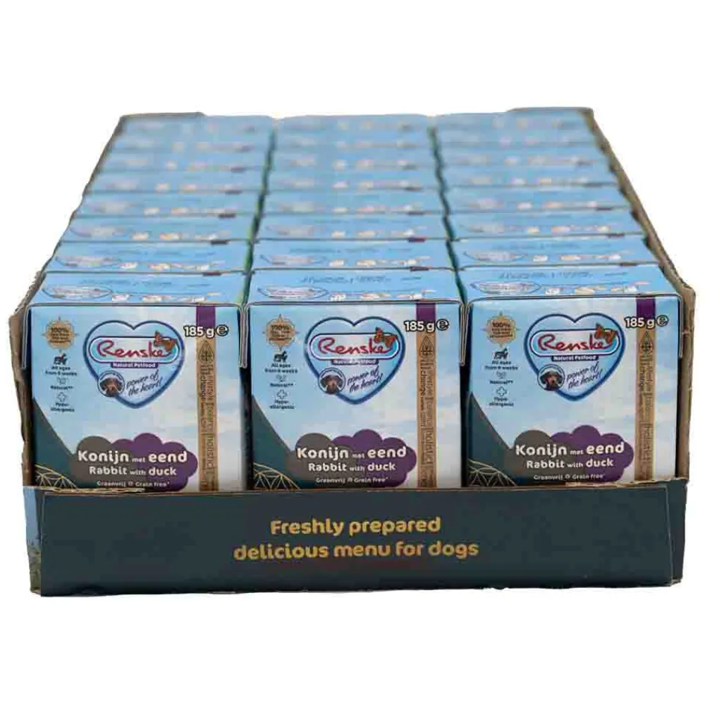 Renske Vers Konijn met Eend Graanvrij is een 100% natuurlijke complete maaltijd met toegevoegde vitamines en mineralen. Rijk aan natuurlijke antioxidanten met een natuurlijke bron van prebiotica door de toevoeging van Xylo-oligosaccharices. Makkelijk mee te nemen op vakantie, shows en dagjes weg. Buiten de koelkast of vriezer bewaren.