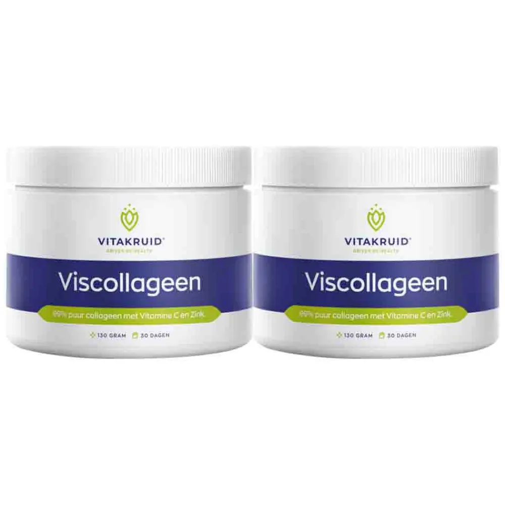 Vitakruid Viscollageen Poeder is een ideale combinatie van Viscollageen, Vitamine C en Zink. Collageen is een lichaamseigen eiwit dat belangrijk is voor de huid, nagels, botten, pezen en bindweefsel. Viscollageen is het meest verwant aan het type dat voorkomt in de menselijke huid. Zink voedt de huid van binnenuit en ondersteunt het herstellend vermogen van de huid. Vitamine C is van belang voor de vorming van collageen wat belangrijk is voor de huid en voor inwendige huidverzorging.