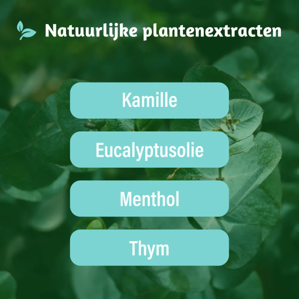 15.2mg kamille-extract, 0.6 mg Thymol, eucalyptusolie, 11.7mg eucalyptusolie en 46.7mg menthol.