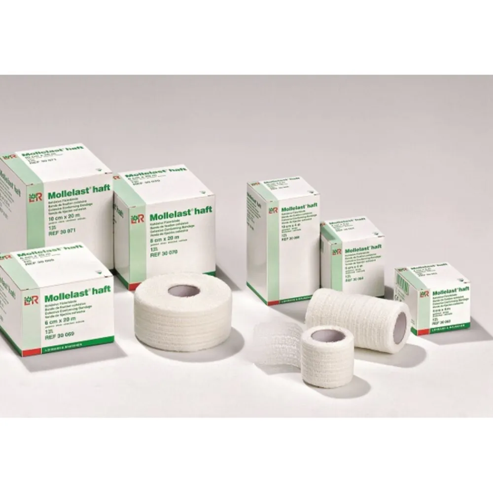 Molle-last haft is rekbaar in de lengte en in de breedte. Deze opvallende eigenschap – in combinatie met het feit dat Mollelast haft zelfhechtend is – zorgt ervoor dat het windsel gemakkelijk en zonder plooien kan worden aangelegd (tijdbesparend).Mollelast haft heeft een afgewerkt zelfkant. Dit voorkomt losse draden en franjes.Mollelast haft is tevens te gebruiken als eenvoudige ondersteuning bij sportactiviteiten en voor het fixeren van canules. Blijft goed op zijn plaats zitten zonder in te snoeren; verstoort de bloedcirculatie niet en is zowel luchtdoorlatend als huidvriendelijk.Geweven windsel, wit, 66% viscose, 34% polyamide, lengte rek tot circa 65%, breedte rek tot circa 50%, klevend door zeer dunne latex coating.