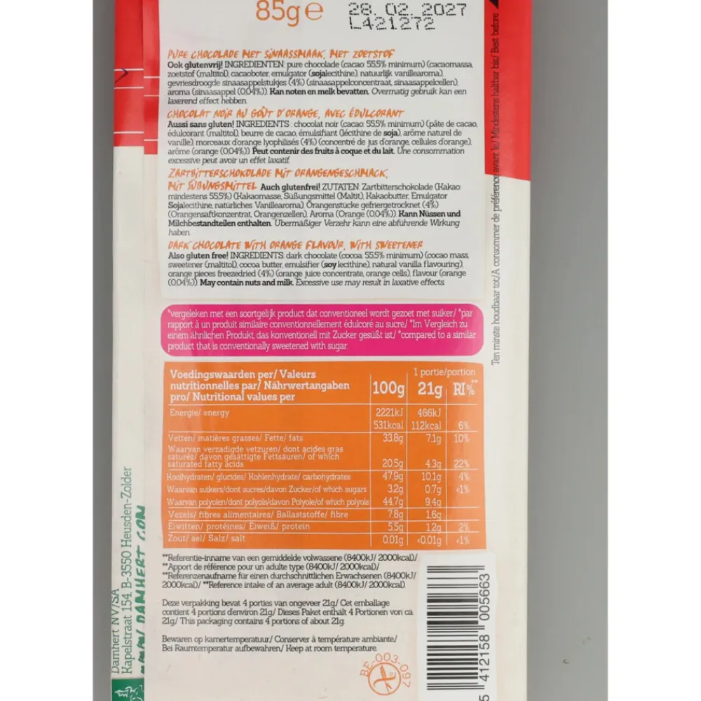 Pure chocolade (cacao: 45,9% minimum) (cacaomassa, zoetstof maltitol, cacaoboter, emulgator: sojalecithine, natuurlijk vanillearoma), stukjes sinaasappel (4,00%), aroma: sinaasappel (0,04%).
