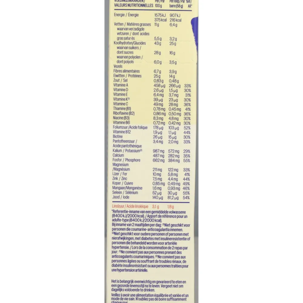 | Voeding | Per 100 g | Per reep (58 g) | %RI* |