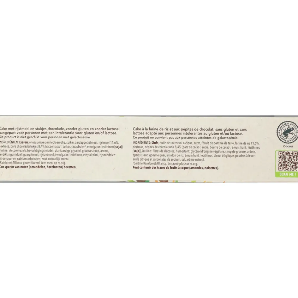 EIEREN, suiker, aardappelzetmeel, oliezuurrijke zonnebloemolie, pure chocoladestukejs 11% (cacaomassa, suiker, cacaoboter, emulgator: SOJA LECITHINEN, natuurlijke vanille aroma), dextrose, rijstbloem, bevochtingsmiddel: glycerol, glycosestroop, emulgator: koolzaadlecithinen, verdikkingsmiddelen: johannesbroodpitmeel en xanthaangom, rijsmiddelen: difosfaten, natriumcarbonaten en calciumfosfaten, zout Kan sporen bevatten van noten