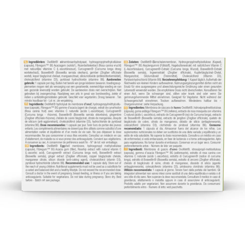 OvoMet eimembraanhydrolysaat, hydroxypropylmethylcellulose (capsule), Fibregum BG Acaciagom (vulstof ), Rozenbottelextract (Rosa canina vrucht) met natuurlijke vitamine C (L-ascorbinezuur), Curcugreen (Curcuma longa droog wortelextract), Boswellin (Boswellia serrata oleohars), gember (Zingiber officinale wortel), koper bisglycinat chelaat, mangaancitraat, siliciumdioxide (antiklontlontermiddel), cholecalciferol (vitamine D3 uit schapenwol), pyridoxal hydrochloride (vitamine B6).
