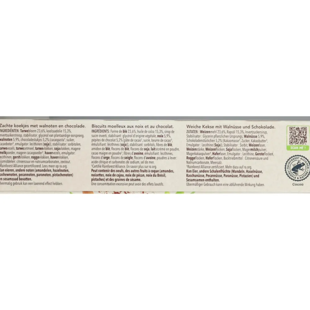 Tarwebloem 23,6%, koolzaadolie 15,3%, invertsuikerstroop, stabilisator: glycerol van plantaardige oorsprong, walnoten 5,9%, chocoladestukjes 5,2% (cacaopasta^1, suiker, cacaoboter^1, emulgator: sojalecithinen), stabilisator: sorbitolen, tarwevezels, tarwezetmeel, tarwevlokken, sojavlokken, magere melkpoeder, magere cacaopoeder^1, havervezels, emulgator: koolzaadlecithinen, gerstvlokken, roggevlokken, havervlokken, rijsmiddelen: citroenzuur en natriumcarbonaten, zeezout.