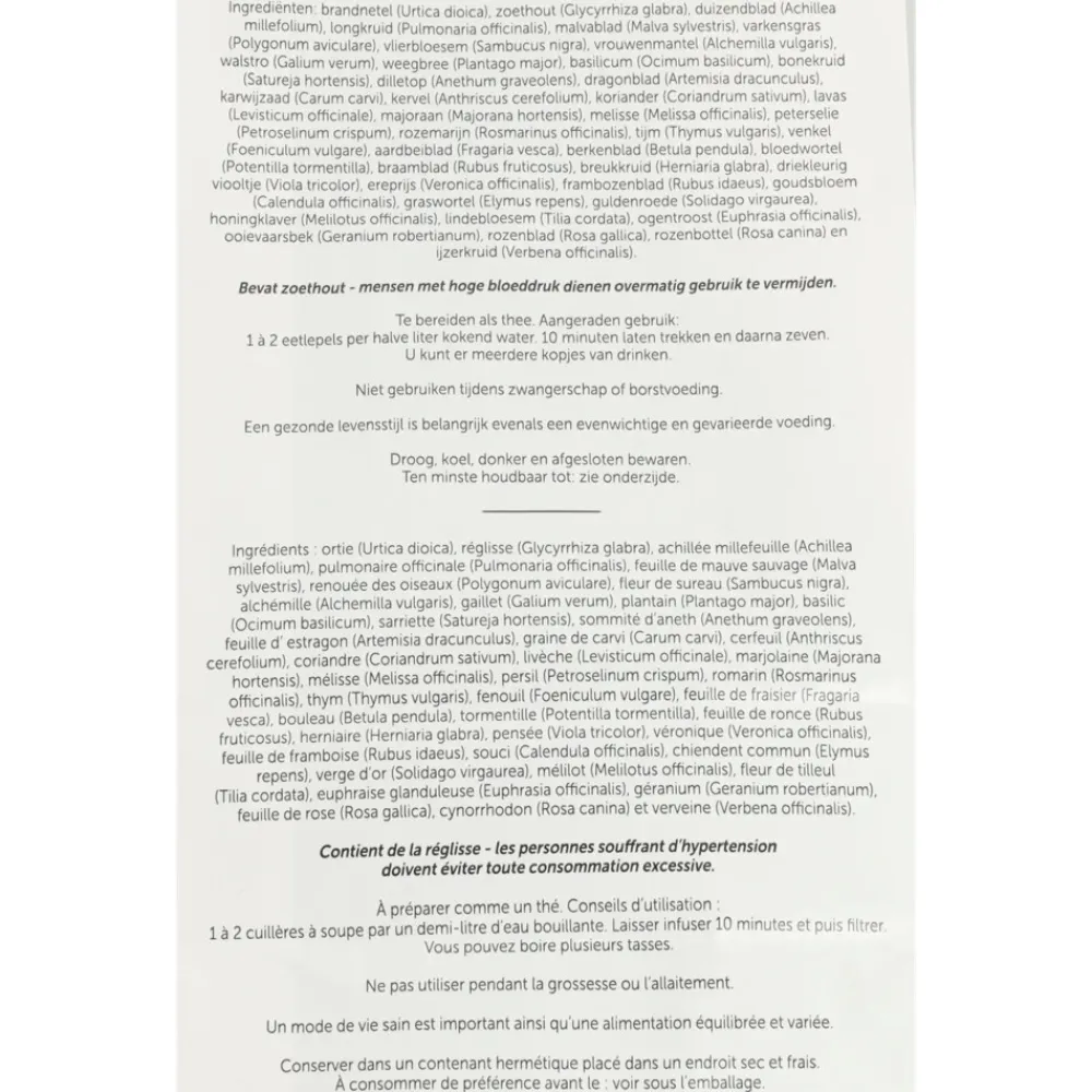 Brandnetel (urtica dioica), zoethout (glycyrrhiza glabra), duizendblad (achillea millefolium), longkruid (pulmonaria officinalis), malvablad (malva sylvestris), varkensgras (polygonum aviculare), vlierbloesem (sambucus nigra), vrouwenmantel (alchemilla vularis), walstro (galium verum), weegbree (plantago major), basilicum (ocimum basilicum), bonenkruid (satureja hortensis), dillentop (anethum graveolens), dragonblad (artemisia dracunculus), karwijzaad (carum carvi), kervel (anthriscus cerefolium), koriander (coriandrum sativum), lavas (levisticum officinale), majoraan (majorana hortensis), melisse (melissa officinalis), peterselie (petroselinum crispum), rozemarijn (rosmarinus officinalis), selderij (apium graveolens), tijm (thymus vulgaris), venkel (foeniculum vulgare), aardbeiblad (fragaria vesca), berkenblad (betula penudula), bloedwortel (potentilla tormentilla), braamblad (rubus fruticosus), breukkruid (herniaria glabra), driekleurig viooltje (viola tricolor), ereprijs (veronica officinalis), frambozenblad (rubus idaeus), goudsbloem (calendula officinalis), graswortel (elymus repens), guldenroede (solidago virgaurea), haverstro (avena sativa), honingklaver (melilotus officinalis), lindebloesem (tilia cordata), ogentroost (euphrasia officinalis), ooievaarsbek (geranium robertianum), rozenblad (rosa gallica), rozenbottel (rosa canina), ijzerkruid (verbena officinalis)., rozenblad, rozenbottel, ijzerkruid.