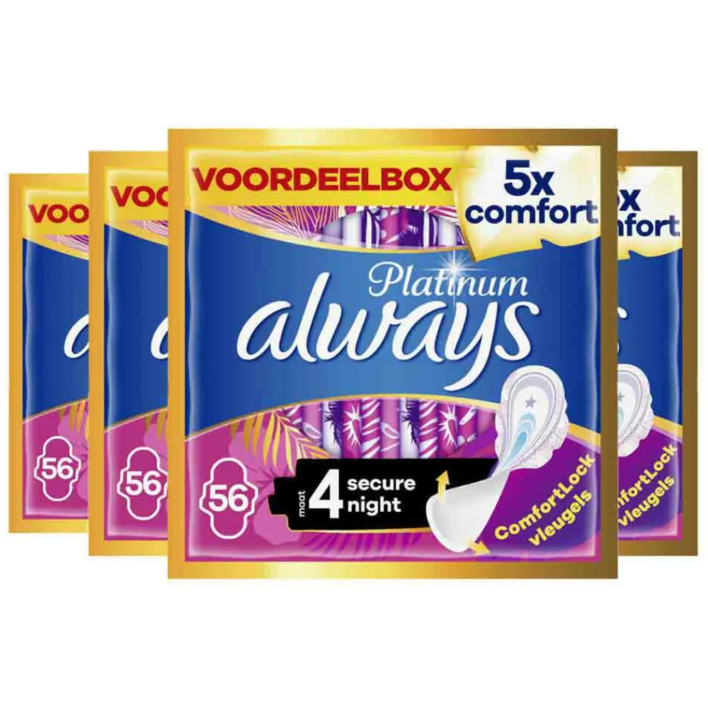 Always Platinum Secure Night (maat 4) heeft een 60%* grotere achterkant, voor extra bescherming waar je dat het meest nodig hebt.