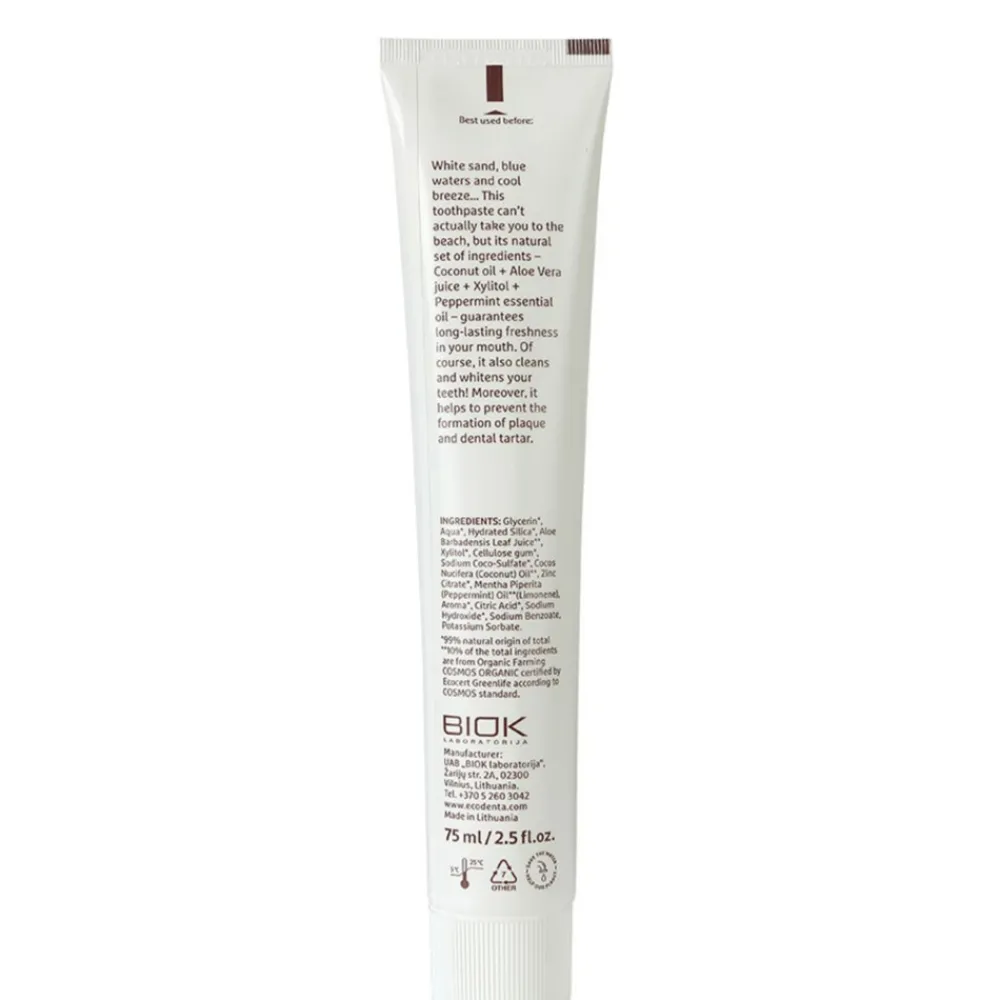 Glycerin*, Aqua*, Hydrated Silica*, Aloe Barbadensis Leaf Juice**, Xylitol*, Sodium Coco-Sulfate*, Cellulose Gum, Cocos Nucifera (Coconut) Oil**, Zinc Citrate*, Mentha Piperita (Peppermint) Oil**, Aroma*, Citric Acid*, Sodium Hydroxide*, Sodium Benzoate, Potassium Sorbate, Limonene.*Ingrediënt van biologische landbouw**Ingrediënt van natuurlijke oorsprong99% van de totale ingrediënten is van natuurlijke oorsprong10% van de totale ingrediënten zijn van biologische landbouw