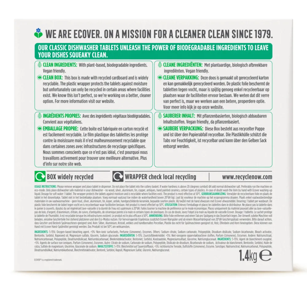 Een sprankelend resultaat voor al je bestek en vaatwerk. De sterk ontvettende eigenschappen van Ecover vaatwastabletten zorgen keer op keer voor een vet- en vlekvrij resultaat, en dat alles zonder die overbodige chemicaliën. Het subtiele parfum zorgt voor een hygiënische spoeling van je vaatwasser.