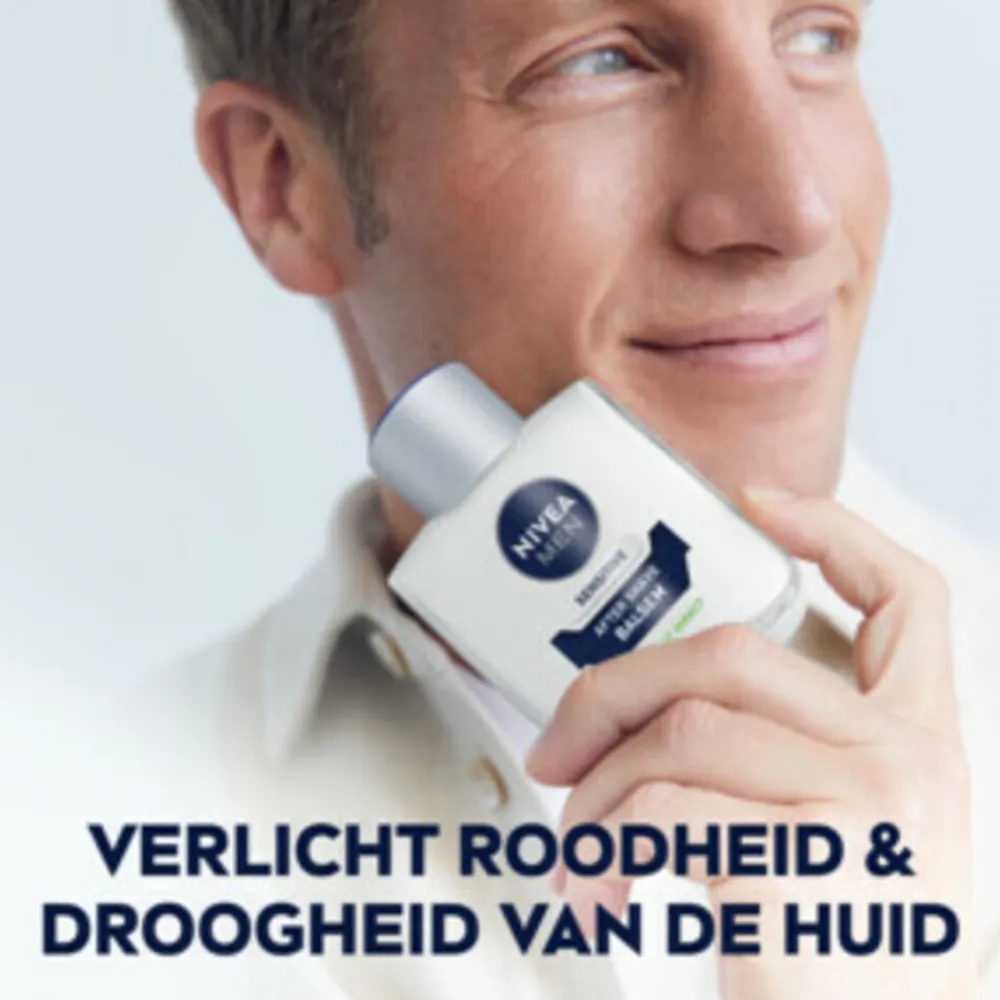 Nivea Men Sensitive After Shave Balsem voor mannen met een gevoelige huid die hun geïrriteerde en rode huid onmiddellijk willen verzachten. Deze rijke balsem verzacht direct 5 tekenen van irritaties na het scheren: een branderig gevoel, roodheid, droogheid, een trekkerig gevoel en een gevoel van jeuk. Huidvriendelijkheid dermatologisch goedgekeurd bij mannen met een gevoelige huid.