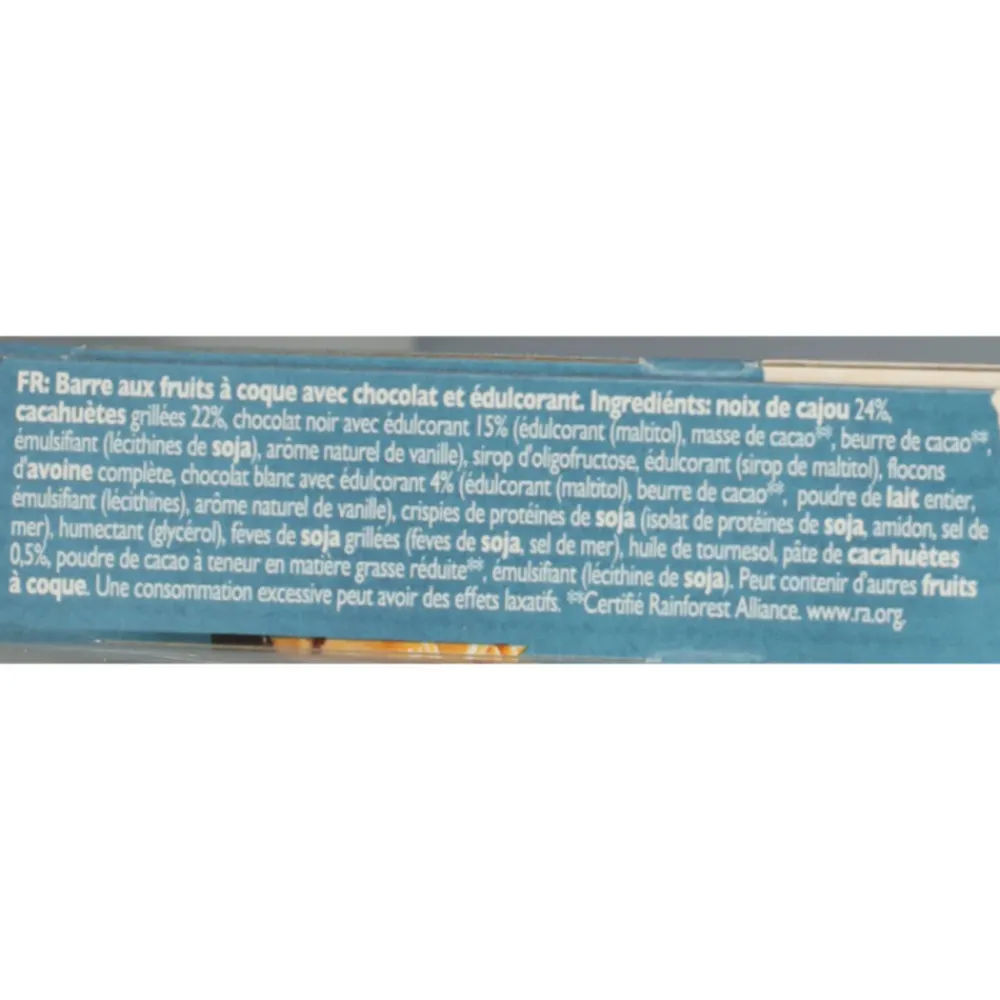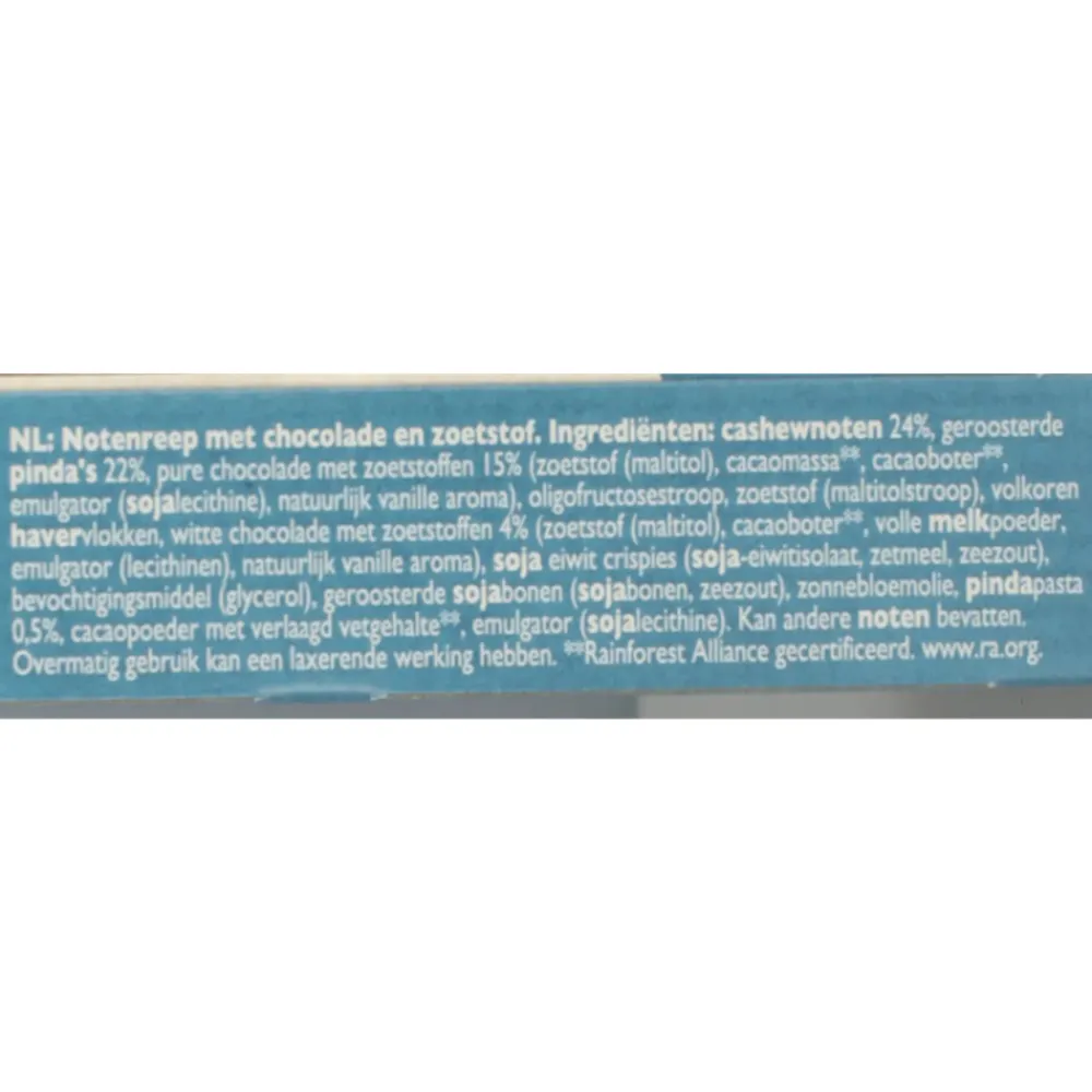 CASHEWNOTEN 24%, geroosterde PINDA’s 22%, pure chocolade met zoetstoffen 15% (zoetstof (maltitol), cacaomassa**, cacaoboter**, emulgator (SOJAlecithine), natuurlijk vanille aroma), oligofructosestroop, zoetstof (maltitolstroop), volkoren HAVERvlokken, witte chocolade met zoetstoffen 4% (zoetstof (maltitol), cacaoboter**, volle MELKpoeder, emulgator (lecithinen), natuurlijk vanille aroma), SOJA eiwit crispies (SOJA-eiwitisolaat, zetmeel, zeezout), bevochtigingsmiddel (glycerol), geroosterde SOJAbonen (SOJAbonen, zeezout), zonnebloemolie, PINDApasta 0,5%, cacaopoeder met verlaagd vetgehalte**, emulgator (SOJAlecithine). Kan andere NOTEN bevatten.