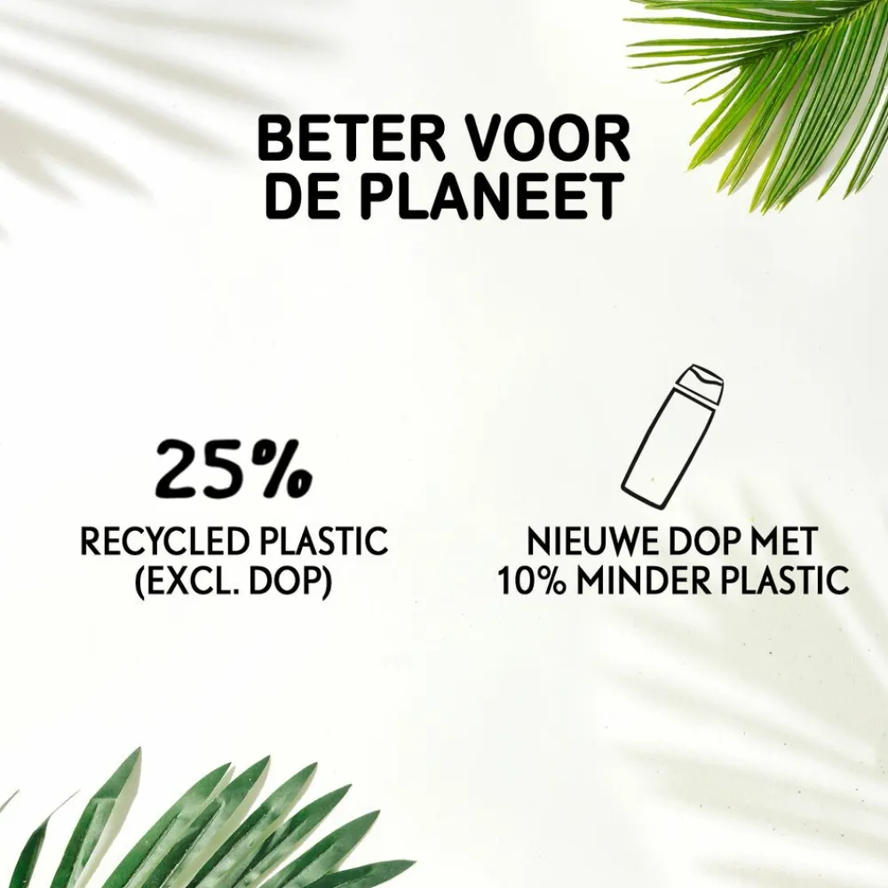 - De verpakking bestaat uit 25% recycled plastic (excl. dop)