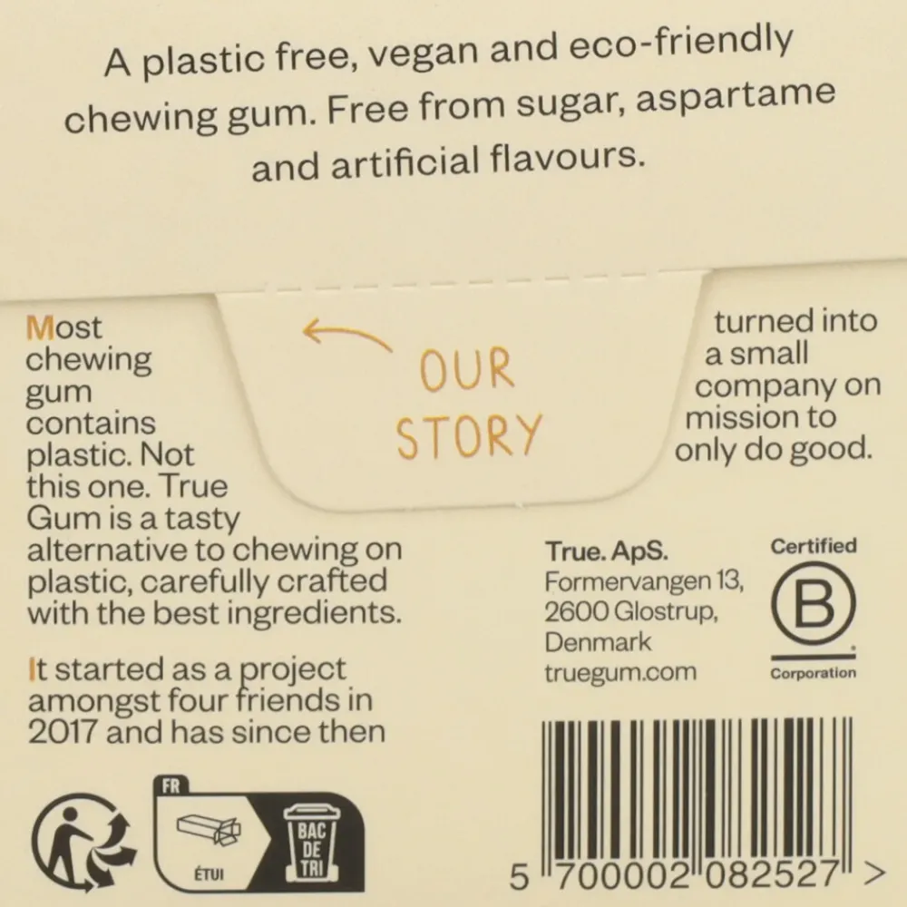 True Gum Ginger & Turmeric is een heerlijke kauwgom met de smaak van aromatische gember en kurkuma. In tegenstelling tot de meeste kauwgoms bevat deze kauwgom geen synthetisch rubber. True Gum is plasticvrij, veganistisch en biologisch afbreekbaar en daardoor beter voor onze planeet. Daarnaast is deze kauwgom ook vrij van kunstmatige smaakstoffen en conserveringsmiddelen.