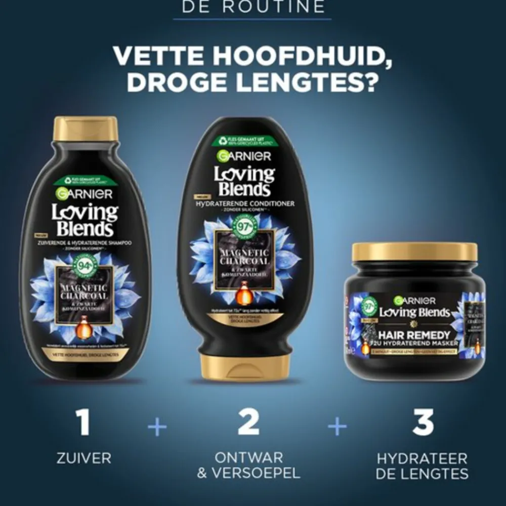 Het Loving Blends Magnetic Charcoal Masker van Garnier is een intens hydraterend masker van 97% natuurlijke oorsprong, speciaal ontwikkeld voor de droge lengtes. Het masker hydrateert de lengtes tot wel 72u*. Garnier Loving Blends heeft hiervoor een formule samengesteld die werkt als een magneet om hydratatie in te sluiten, voor gezonde & gevoede lengtes zonder vettig effect.