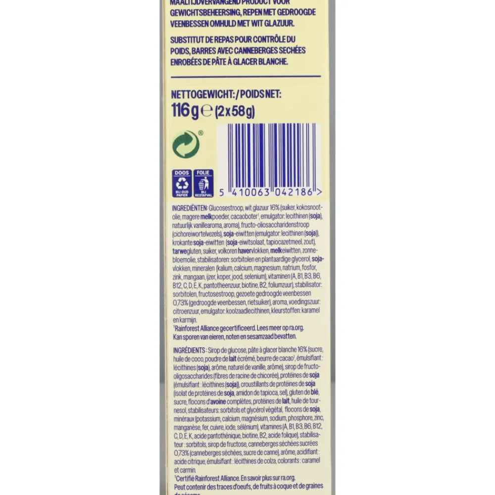 Glucosestroop, wit glazuur 16% (suiker, kokosnootolie, magere melkpoeder, cacaoboter^1, emulgator: lecithinen (soja), natuurlijk vanillearoma, aroma), fructo-oliosaccharidenstroop (cichoreiwortelvezels), soja-eiwitten (emulgator: lecithinen (soja)), krokante soja-eiwitten (soja-eiwitsolaat, tapiocazetmeel, zout), tarwegluten, suiker, volkoren havervlokken, melkeiwitten, zonnebloemolie, stabilisatoren: sorbitolen en plantaardige glycerol, sojavlokken, mineralen (kalium, calcium, magnesium, natrium, fosfor, zink, mangaan, ijzer, koper, jood, selenium), vitaminen (A, B1, B3, B6, B12, C, D, E, K, pantotheenzuur, biotine, B2, foliumzuur), stabilisator: sorbitolen, fructosestroop, gezoete gedroogde veenbessen 0,73% (gedroogde veenbessen, rietsuiker), aroma, voedingszuur: citroenzuur, emulgator: koolzaadlecithinen, kleurstoffen: karamel en karmijn.